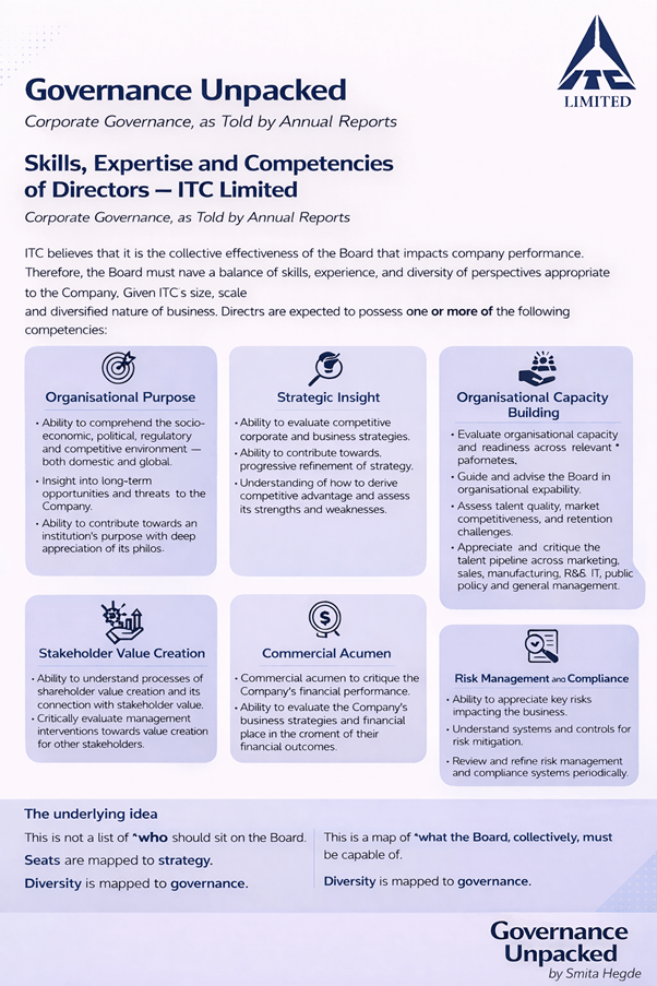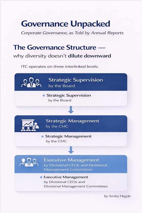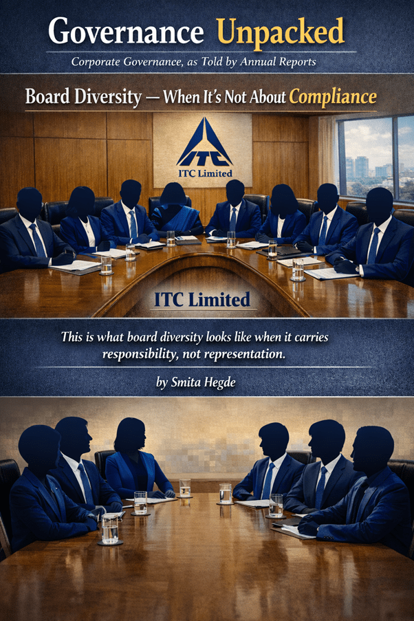 This article examines how ITC Limited uses board diversity as a governance mechanism rather than a compliance requirement. In the absence of a promoter or dominant ownership voice, the Board is structured to bring together diverse professional perspectives that collectively guide strategy, evaluate risk, and maintain long-term stewardship. The article explains how ITC’s skills matrix, committee structure, and evaluation processes transform diversity into a functional governance design that strengthens decision-making across the organisation.