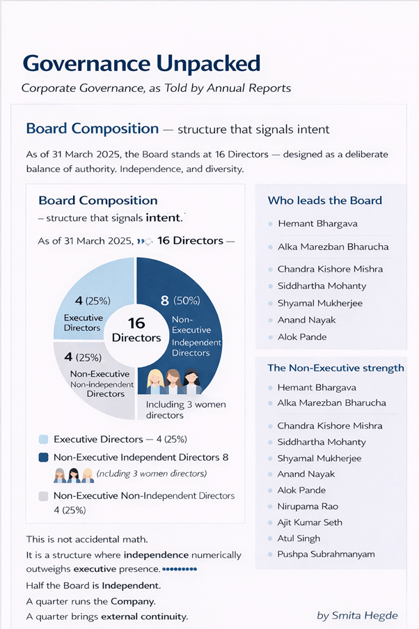 In the absence of a promoter voice, the company cannot rely on ownership instinct to guide long-term direction. So the Board is designed in a way where different minds collectively perform that role.